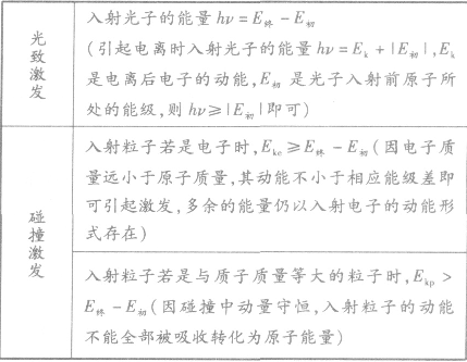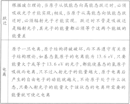 在原子的躍遷及電離等過程中,總能量仍是守恒的。原子被激發(fā)時,原子的始末能級差值等于所吸收的能量,即入射光子的全部能量或者入射粒子的全部或部分能量;原子被電離時,電離能等于原子被電離前所處能級的絕對值,原子所吸收的能量等于原子電離能與電離后電離出的電子的動能之和;輻射時輻射出的光子的能量等于原子的始末能級差。氫原子的能級 F 關(guān)系為
