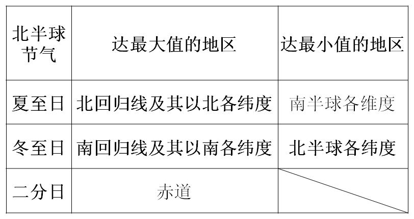 | 夏至 | 北回歸線 | 北回歸線正午太陽(yáng)高度為90°,由北回歸線向南北兩側(cè)遞減 |
