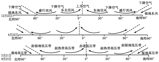 (2)風(fēng)帶的分布是以赤道為軸南北對(duì)稱分布的,即南北半球的信風(fēng)帶、西風(fēng)帶和極地東風(fēng)帶。