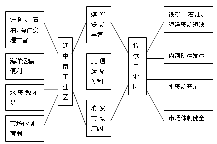 影響遼中南工業(yè)區(qū)區(qū)位選擇的主導(dǎo)因素是豐富的自然資源。遼中南工業(yè)區(qū)與德國(guó)魯爾區(qū)的異同可用下圖表示: