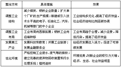 20世紀(jì)60年代,魯爾區(qū)開(kāi)始綜合整治,經(jīng)過(guò)綜合整治,魯爾區(qū)經(jīng)濟(jì)結(jié)構(gòu)趨于協(xié)調(diào),工業(yè)布局趨于合理,經(jīng)濟(jì)由衰落轉(zhuǎn)向繁榮,改變了重工業(yè)環(huán)境污染嚴(yán)重的局面,成為環(huán)境優(yōu)美地區(qū)。