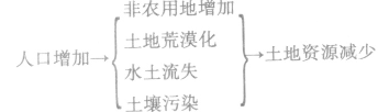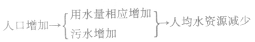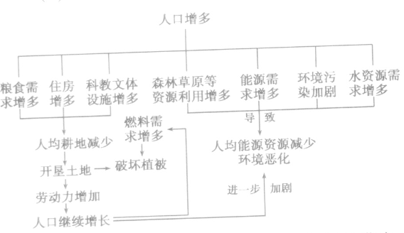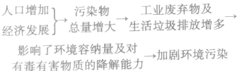 ②人口增加,人類需求也不斷增加,為了滿足衣食住行的需求和經(jīng)濟(jì)發(fā)展,從而導(dǎo)致污染物的總量增大,大量工農(nóng)業(yè)廢棄,人均耕地減少,人均能源資源減少,進(jìn)一步加劇環(huán)境惡化。