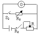 ①測量方法:電流表半偏法測電阻的電路圖如圖,R為滑動變阻器,R0為電阻箱,G為待測電流表內(nèi)阻。實驗時,先合上S1,斷開S2,調(diào)節(jié)R使電流計的指針滿偏;再合上S2,調(diào)節(jié)R0使電流計的讀數(shù)為滿刻度的一半,這時,電阻箱的數(shù)值即為電流計的內(nèi)阻。(注意:實驗前,變阻器的阻值應(yīng)放在最大位置;調(diào)節(jié)R0時,R不動)
