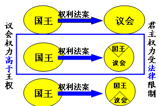 君權(quán)神授遭到否定,君主權(quán)力由法律賦予,受到法律嚴(yán)格制約。議會不但掌握制定法律的權(quán)力,還可以監(jiān)督政府和決定重大的經(jīng)濟(jì)政策。議會的權(quán)力日益超過國王的權(quán)力,國王開始逐漸處于“統(tǒng)而不冶”的地位,英國的君主立憲制確立起來。