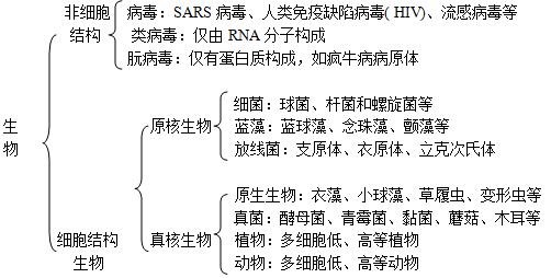 2、有細(xì)胞結(jié)構(gòu)的生物分為真核和原核生物,沒(méi)有細(xì)胞結(jié)構(gòu)的生物就是病毒。