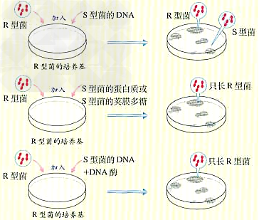 e、實驗分析:①只有S型細(xì)菌的DNA能使R型細(xì)菌發(fā)生轉(zhuǎn)化。 ②DNA被水解后不能使R型細(xì)菌發(fā)生轉(zhuǎn)化。