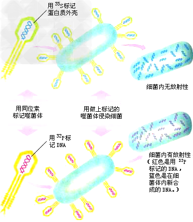 科學(xué)家首先用放射性同位素35S標(biāo)記了一部分噬菌體的蛋白質(zhì),并用放射性同位素32P標(biāo)記了另一部分噬菌體的DNA,然后,用被標(biāo)記的T2噬菌體分別去侵染細(xì)菌(上圖),當(dāng)噬菌體在細(xì)菌體內(nèi)大量增殖時,生物學(xué)家對被標(biāo)記物質(zhì)進(jìn)行測試。