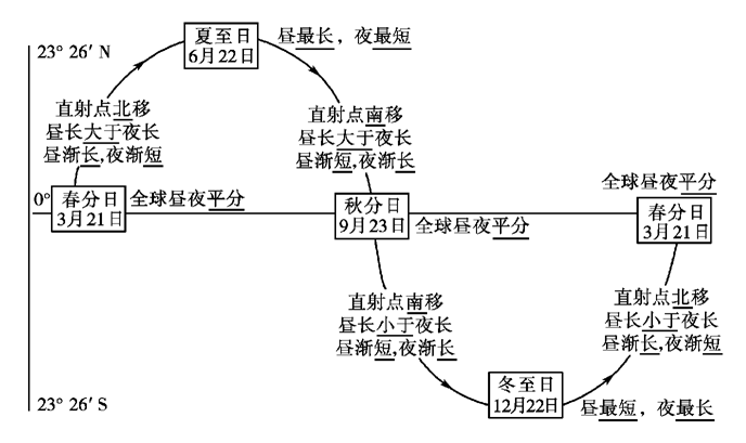 (3)黃赤交角的影響:由于黃赤交角的存在,并且地軸在宇宙空間的方向不因季節(jié)而變化,因而,太陽(yáng)直射點(diǎn)相應(yīng)地在南北回歸線之間往返移動(dòng)。