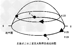 在極晝期間,北極點(diǎn)上,由于太陽(yáng)周日視平圈始終平行于地平圈,在一天中太陽(yáng)高度沒有變化,始終等于該日直射點(diǎn)的緯度,太陽(yáng)只有方位變化而無(wú)升落,因而不存在升落方位問題。在春分秋分日,極點(diǎn)晝夜平分,此時(shí)太陽(yáng)高度為0°,剛好沒入地平圈。