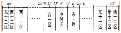 2)以0°經(jīng)線為中央經(jīng)線,向東、西方向各取7.5°,合計(jì)為15°,該時(shí)區(qū)稱為中時(shí)區(qū)(或零時(shí)區(qū))。