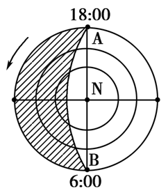 (2)確定地方時(shí)過晨線與赤道交點(diǎn)的經(jīng)線地方時(shí)是6∶00,過昏線與赤道交點(diǎn)的經(jīng)線地方時(shí)是18∶00,如右圖中BN地方時(shí)是6∶00, AN地方時(shí)是18∶00。