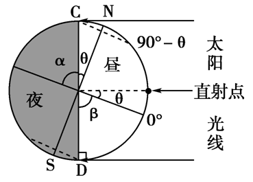(3)直射點(diǎn)A與晨昏線和極晝(夜)最小緯線圈切點(diǎn)B的緯度之和等于90°;