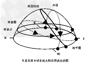 北半球冬至日太陽(yáng)直射南回歸線,南極圈及其以內(nèi)出現(xiàn)極晝,赤道地區(qū)太陽(yáng)從正東偏南23°26′垂直升起,從正西偏南23°26′垂直落下。緯度越高,日出偏移正東向南的角度和日落偏移正西向南的角度越大,到極圈時(shí)剛好日出日落位于正南方。