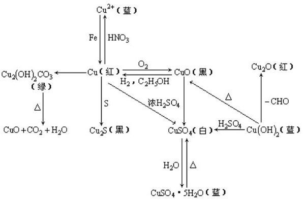 2CuO+CO2↑+H2O↑,溶于酸生成相應的銅鹽,也可溶于氰化物、銨鹽而形成銅的配合物。