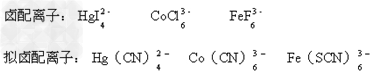 由兩個或兩個以上電負(fù)性較大的元素的原子組成的原子團(tuán),而這些原子團(tuán)在自由狀態(tài)時與鹵素單質(zhì)性質(zhì)相似,故稱擬鹵素。它們的陰離子則與鹵素陰離子性質(zhì)也相似,故稱擬鹵離子。目前已經(jīng)分離出的擬鹵素有氰(CN)2、氧氰(OCN)2、硫氰(SCN)和硒氰(SeCN)2。常見的擬鹵離子有氰根離子CN-、氰酸根離子OCN-、異氰酸根離子ONC-、硫氰根離子SCN-、硒氰根離子SeCN-、碲氰根離子TeCN-和疊氮酸根離子N3-等。但N3-和TeCN-雖也有鹵離子相似的性質(zhì),但它沒有與單質(zhì)鹵素相應(yīng)的母體。