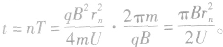 ④帶電粒子在回旋加速器內的運動時間。帶電粒子在回旋加速器內運動時間的長短,與帶電粒子做勻速圓周運動的周期有關,同時還與帶電粒子在磁場中轉動的圈數(shù)有關。設帶電粒子在磁場中轉動的圈數(shù)為n,加速電壓為U。因每加速一次粒子獲得的能量為qU,每圈有兩次加速。結合