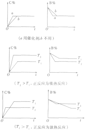 2.含量一時(shí)間一溫度(壓強(qiáng))圖常見的形式有下圖所示的幾種(C%指某產(chǎn)物百分含量,B%指某反應(yīng)物百分含量),這些圖像的折點(diǎn)表示達(dá)到平衡的時(shí)間,曲線的斜率反映了反應(yīng)速率的大小,可以確定T(p)的高低(大小),水平線高低反映平衡移動(dòng)的方向。