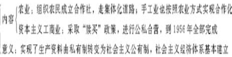 4、意義:社會主義歷史上第一次有效地實現(xiàn)對資產(chǎn)階級的和平贖買,是中國共產(chǎn)黨對馬克思主義的一個創(chuàng)造。