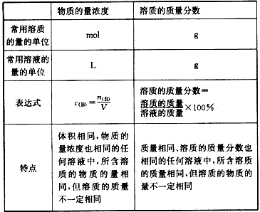 物質(zhì)的量濃度與質(zhì)量分數(shù)(質(zhì)量百分比濃度)的比較: