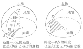 ②某點的經(jīng)度是經(jīng)過這點的經(jīng)線與地軸確定的半平面和本初子午線(00經(jīng)線)與地軸確定的半平面所成的二面角度數(shù).此角實則為二面角,某點的緯度是經(jīng)過這點的球半徑與赤道面所成角的度數(shù),此角實則為線面角.下面用圖標(biāo)注.