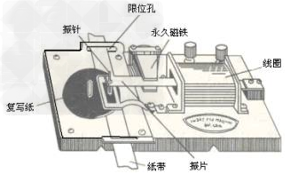 是一種記錄運(yùn)動(dòng)物體在一定時(shí)間內(nèi)發(fā)生的位移的計(jì)時(shí)儀器,它使用交流電源,由學(xué)生電源供電,工作電壓在6V以下,當(dāng)電源的頻率是50Hz時(shí),它每隔0.02s打一個(gè)點(diǎn),通電前把紙帶穿過限位孔,再把套在軸上的復(fù)寫紙片壓在紙帶的上面,接通電源后,在線圈和永久磁鐵的作用下,振片便振動(dòng)起來,帶動(dòng)其上的振針上下振動(dòng)。這時(shí),如果紙帶運(yùn)動(dòng),振針就通過復(fù)寫紙?jiān)诩垘狭粝乱恍行↑c(diǎn)。如果把紙帶跟運(yùn)動(dòng)的物體連在一起,即由物體帶動(dòng)紙帶一起運(yùn)動(dòng),紙帶上各點(diǎn)之間的距離就表示相應(yīng)時(shí)間間隔中物體的位移。