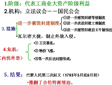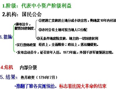 | 雅各賓派 | 1793.6?1794.7 | 中小資產(chǎn)階級(jí) | 國(guó)民公會(huì) | 結(jié)束封建制度;實(shí)行恐怖政策;全國(guó)動(dòng)員法令 |