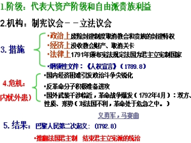 | 君主立憲派 | 1789.7?1792.8 | 大資產(chǎn)階級(jí)和自由派貴族大資產(chǎn)階級(jí)和自由派貴族 | 制憲議會(huì) 立法議會(huì) | “八月法令” ; 《人權(quán)宣言》; 1791年憲法 |