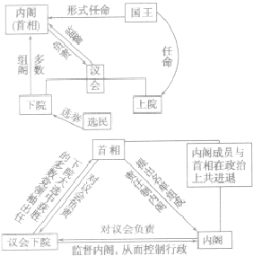 ①責(zé)任制內(nèi)閣簡稱內(nèi)閣,內(nèi)閣的首腦是首相,內(nèi)閣成員是各部大臣。內(nèi)閣成員集體負(fù)責(zé),必須在大政方針上保持一致,要與首相共進(jìn)退。