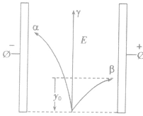 定量地來講:(1)不論在電場(chǎng)還是磁場(chǎng)中,γ射線總是做勻速直線運(yùn)動(dòng),不發(fā)生偏轉(zhuǎn)。(2)在勻強(qiáng)電場(chǎng)中,α粒子和β粒子沿相反方向做類平拋運(yùn)動(dòng),且在同樣的條件下,β粒子的偏移大。