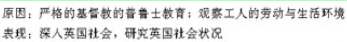 (1)在中學(xué)時(shí)代就關(guān)注工人階級(jí)的命運(yùn),樹(shù)立起“幫助勞動(dòng)人民”的價(jià)值觀,并深入研究了英國(guó)社會(huì)狀況,確立了生產(chǎn)力決定生產(chǎn)關(guān)系、經(jīng)濟(jì)基礎(chǔ)決定上層建筑的歷史唯物主義世界觀。 (2)資本家對(duì)工人階級(jí)的殘酷剝削和唯利是圖,使恩格斯堅(jiān)信工人階級(jí)將利用斗爭(zhēng)獲得自身的解放,并在社會(huì)變革中起到?jīng)Q定性的作用。