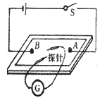 2、在導電紙上平放兩個跟它接觸良好的圓柱形電極,兩個電極之間的距離約為10cm,將兩個電極分別與電壓約為6V的直流電源的正負極相接,作為“正電荷”和“負電荷”,再把兩根探針分別接到靈敏電流計的“+”、“-”接線柱上(如圖所示)。