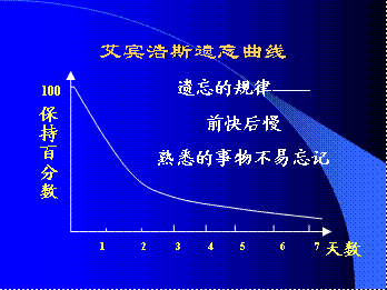要進行有效的復(fù)習(xí),首先要了解遺忘的過程。心理學(xué)家艾賓浩斯對遺忘現(xiàn)象作了系統(tǒng)的研究,下面的曲線就是他的重要研究成果,也是心理學(xué)家普遍公認的結(jié)論。