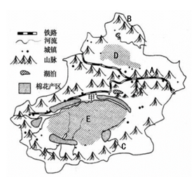 (1)農(nóng)業(yè):畜牧業(yè)與綠洲農(nóng)業(yè),主要的牧場有天山牧場和阿爾泰山牧場,綠洲農(nóng)業(yè)屬于灌溉農(nóng)業(yè)(種植業(yè)),主要分布于塔里木盆地和準噶爾盆地的邊緣(水源主要來自高山冰雪融水和地表水),農(nóng)作物有長絨棉、甜菜、小麥等。