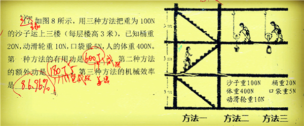 該題說的是:用三種方法把沙子運上三樓,每層樓高3米!已知沙子重力、鐵桶的重力、袋子的重力、人的體重、動滑輪的重力,求三種方法的有用功、額外功以及機械效率。
