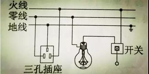 (2)三孔插座:左孔接零線,右孔接火線,上孔接地線;