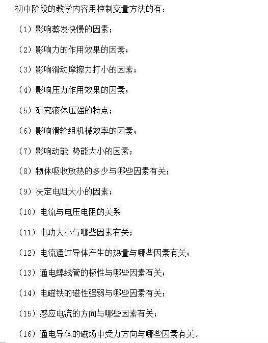 1、控制變量法:該方法是研究某一物理量(或某一物理性質(zhì))與哪些因素有關(guān)時(shí)所采用的研究方法,研究方法是:控制其他各項(xiàng)因素都不變,只改變某一因素,從而得到這一因素是怎樣影響這一物理量的。